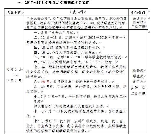 2017~2018学年第二学期教学工作即将结束,为了保证本学期各项教学工作顺利完成和下学期初教学工作正常运转,特制订《2017~2018学年第二学期期末和2018~2019学年第一学期期初教学工作安排》。经 6月6日校长办公会审定通过,现予以印发,请遵照执行。