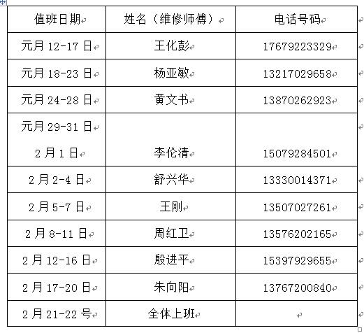 寒假临近,现将寒假期间水电维修小修安排通知如下,请需要进行水电维修小修的用户按照安排表拨打维修人员电话。