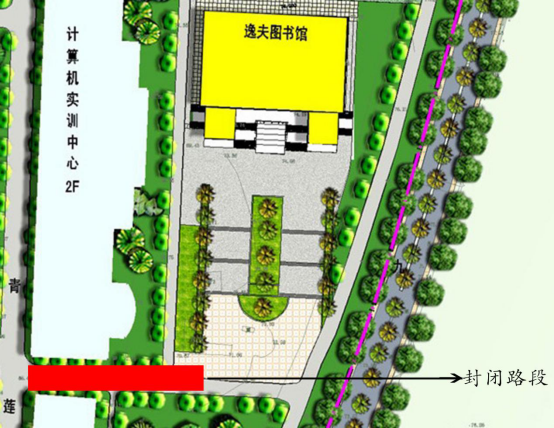 因学校主校区(丹枫园)与新校区(紫薇园)的连接通道(时光隧道)工程建设施工需要,现临时封闭逸夫图书馆广场前道路至青莲路局部路段(见附图)。封闭期间,广大教职工可以从实训楼东南角人行便道进入逸夫图书馆;所有机动车辆可以通过外环路进出逸夫图书馆。封闭时间:2020年12月15日至2021年3月15日。道路封闭期间给您造成不便,敬请谅解。