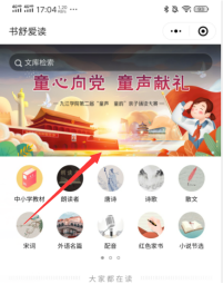 1、进入主图一楼书舒朗读亭,或通过微信小程序“书舒爱读”,进入“童心向党,童声献礼”板块,选择一篇文章,进行朗读并保存。