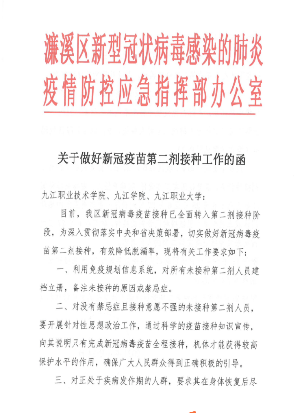目前,永利yl23411集团官网临时接种点新冠病毒疫苗接种工作已基本结束,为深入贯彻落实中央和省市决策部署,切实做好新冠病毒疫苗第二剂接种,有效降低脱漏率,按照濂溪区防控指挥部《关于做好新冠疫苗第二针接种工作的函》的要求,现将学校进一步做好新冠疫苗第二剂接种工作通知如下: