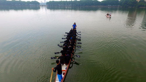 龙舟队是永利yl23411集团官网的传统特色运动队,学校领导以及学院领导都给予很大的支持与帮助,不断改善训练条件和训练待遇,为龙舟队的训练、比赛提供良好的后勤保障。成绩的取得离不开领导的关心,也离不开全体队员、教练员的艰辛付出。在教练员周海浪、贺静、王向棋的带领下,队员们坚持全年训练,特别是水上训练,他们克服高温、雨水天气,坚持每天下水训练,动感的鼓声、整齐的划桨、激情的呐喊,已经成为南门湖上一道美丽的风景线。