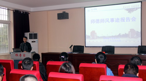 根据《九江学院师德师风建设专项教育活动方案》精神,结合“三严三实”、“两学一做”主题教育活动的要求, 1月6日下午,学校在机材实验楼206会议室举办了“师德师风先进事迹报告会”,陶春元副校长出席活动,教务处处长马明亮、副处长张伏龙、第二期新进教师研习营学员共计70余人参加,报告会由张伏龙副处长主持。