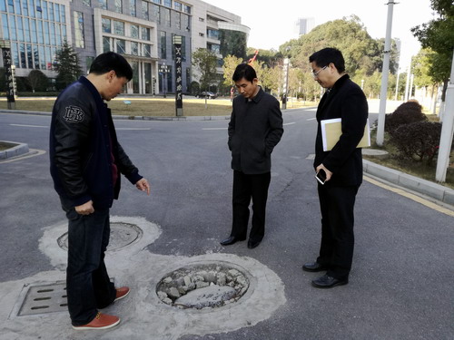 魏立平副书记认真仔细检查了八里湖校区的环境卫生,就发现的问题提出了整改意见,要求各单位恪守职责,抓小抓细抓实,营造文明优美的校园环境。