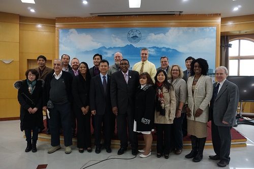 会后,访问团成员一行在副校长杨耀防的陪同下前往校园新区青衿园、五柳湖等地参观,杨副校长耐心地为访问团成员介绍九江学院的校园景观,在白鹿洞书院学规的石碑前,为他们讲述中国古代书院的教育方针,“博学之,审问之,慎思之,明辨之,笃行之”,访华团成员被九江学院优美的校园风光所深深吸引。