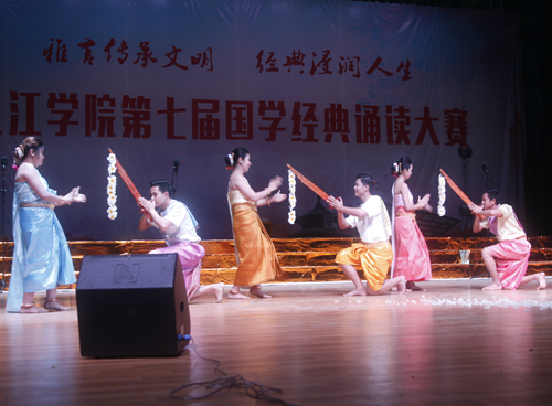 诗以言志,歌以壮行。在预赛中胜出的化环学院、文传学院、外国语学院等10支代表队,深情演绎了《春江花月夜》《红岩魂》《丝绸之路》等经典篇目。比赛中,选手们全身心投入,台上一边是同学们深情并茂的高声吟诵,一边是他们精心设计的舞蹈、歌唱、舞台剧,在声、光、电等现代技术的配合下,同学们用自己的方式诵国学、唱国学、演国学。同学们的精彩演出让大家感悟到了中华经典文化的魅力。比赛现场,来自柬埔寨的留学生们为大家奉献了《祈福舞》,他们的助演得到了大家的阵阵掌声。