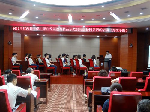 传生涯理念、走规划方略、强实战技能、助教学相长。6月13日下午,由省教育厅主办,省高等院校毕业生就业工作办公室承办,九江学院协办的2017年江西省大学生职业发展教育精品示范课程进校园活动第四场在永利yl23411集团官网逸夫图书馆学术报告厅举行。省就业办公室副主任舒正鸣,就业管理科科长游京峰、副科长李白玲出席此次活动;江西建设职业技术学院、江西财经职业学院、九江职业技术学院、九江职业大学和九江学院有关师生代表300余人参加了此次活动。活动由九江学院招生就业处处长肖国丰主持。