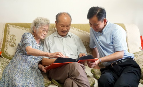 拜访过程中,潘际銮院士还十分愉快地和赵伟、陈春生一行分享了童年在九江生活学习的经历。童年三马路上因江水漫过门前时搭起的跳板,从二楼买菜吊下来的竹篮,春游时母亲在路口塞到手里的五粒粽子糖,以及他和夫人曾在同一时期分别在相邻的滨兴洲小学和翘秀小学就读,且同住一栋楼,却在五十年后两人才知晓的缘分,在一张张照片、一段段往事中,成为院士对家乡浓得化不开的情节和热爱。