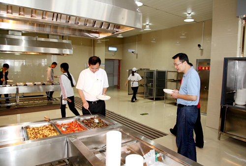 最后,赵伟还到艺术学院学生食堂检查并听取了学生食堂负责人就伙食以及食品卫生安全情况汇报。并请陪同检查的各部门负责人体验学生食堂自选用餐,与学生们一起就餐。