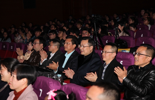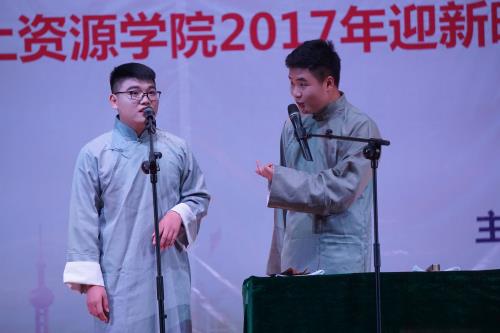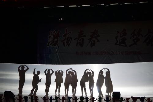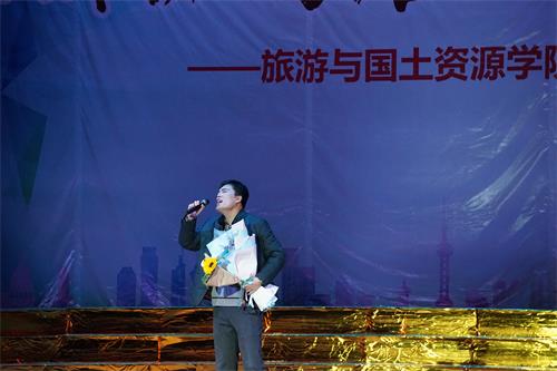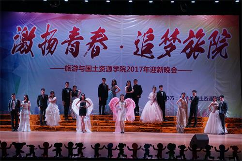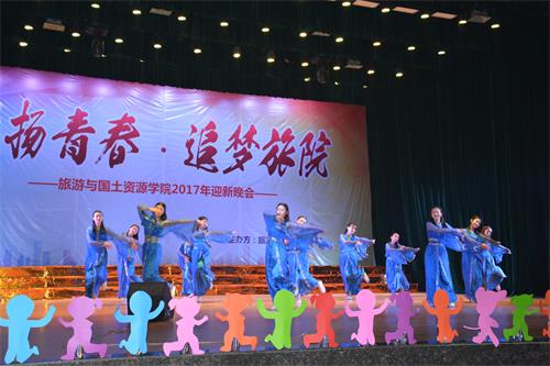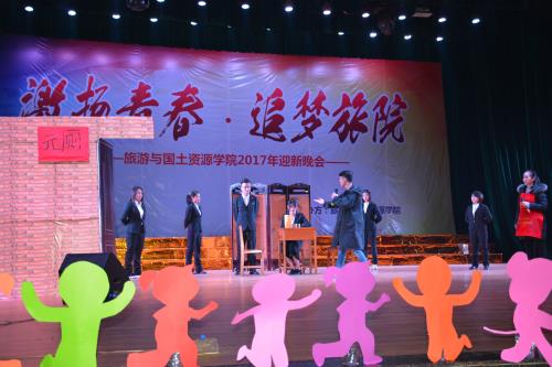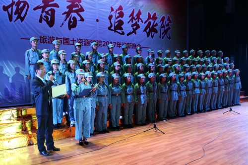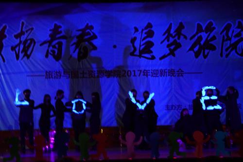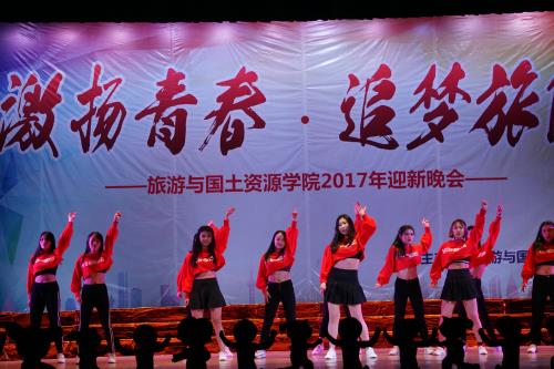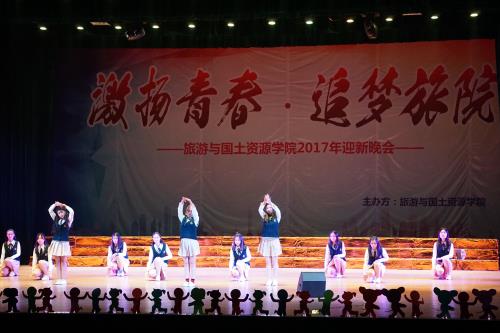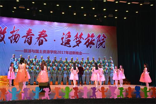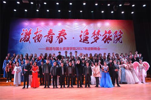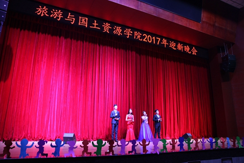 12月3日晚,旅游与国土资源学院在主校区大礼堂举行了2017年迎新晚会。校长刘晓东到场观看晚会并领唱合唱《我的祖国》,学生处、校团委负责人、旅游与国土资源学院党政领导以及学院全体师生共同观看了演出。