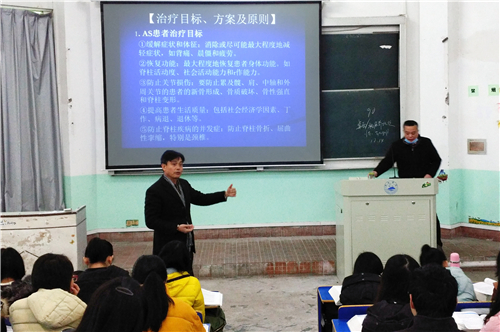 课堂上,罗余生教授讲授的内容是“强直性脊柱炎”。罗教授讲课密切联系临床实际,以临床病例的动态图片与书本内容相结合,讲课生动明了。学生听讲认真,学习兴趣浓厚,课堂教学效果良好。