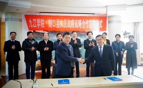 在热烈的掌声中,九江学院校长刘晓东和湖口县县长鲍成庚在九江学院与湖口县人民政府举行战略合作协议书上签字。