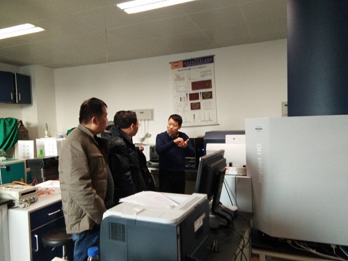 聂宗秀研究员热情接待了曹小华副院长一行,宾主双方在中科院化学所“活体分析化学实验室”进行了深入交流。聂研究员简要介绍了他领衔的现代质谱课题组人员结构、仪器设备和研究领域,详细介绍了该团队在活体质谱成像领域所做的前沿工作。曹小华教授和占昌朝教授就多酸化学课题组研究情况进行了汇报,彭游教授和孙剑奇博士介绍了天然产物化学课题组近年来所做的工作。两个课题组分别就合作研究的思路和初步方案与聂研究员展开了详细深入的讨论,充分论证了合作的可行性和必要性,并就后续深度合作事宜达成了一致意见。聂研究员还带领曹小华一行实地参观了活体分析化学实验室,并对多酸课题组提供的磷钼酸钠等样品质谱成像进行了现场实验。