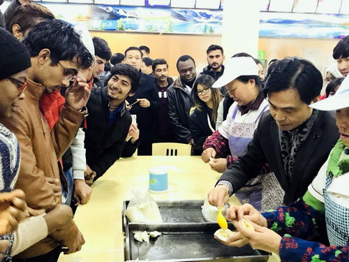 农历新年是中华民族悠久的历史传统,年夜饭又是过年的最重要习俗。年夜饭也称团圆饭,代表着家庭团圆和美。为了使留学生能在异国他乡同样感受到家庭的温暖和学校的关爱,学校后勤管理处联合国际交流学院为160余名留学生精心准备了此次年夜饭,年夜饭上菜品丰富,除了有中国过年传统时令食物春卷、饺子、黄金糕,还有十分适合留学生口味的拌沙拉、咖喱饭和罗宋汤。同时考虑到让留学生亲身参与体会中华民族传统习俗,还特意安排了现场包饺子、写春联,饭后贴对联等喜闻乐见的活动,整个活动在欢乐、祥和的氛围中进行。