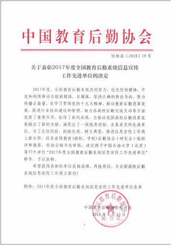 本次评比经全国各高校自行申报,省级教育主管部门和后勤协会组织评审后推荐,经中国教育后勤协会秘书处审核,全国共有77家单位被评为“2017年度全国教育后勤系统信息宣传工作先进单位”。根据宣传信息大数据统计分析,现场表彰公布了“2017年度全国高校后勤宣传力排行榜”,永利yl23411集团官网后勤管理处以江西省第一的优异成绩荣登全国第九位。