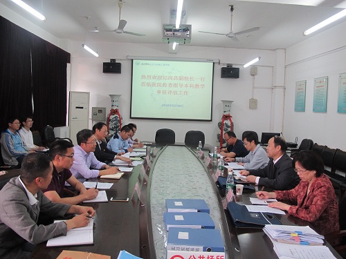 汇报会上,纪岗昌副校长简要介绍了本次督查工作的目的,他要求大家要坚决贯彻学校关于本科审核评估的部署,严格按照学校评估办的工作要求,争取在评估中取得优异成绩。实验中心黄冬久副主任介绍了整个督查过程的工作程序,督查工作小组将按照听取汇报、访谈学院主要负责人、查阅教学资料、听课看课及走访专家考察路线等部分依次进行。