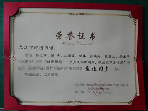 图书馆《濂溪》刊物荣获“2017年中国图书馆阅读推广类十佳内刊内报”荣誉称号。“蝶湖微阅——书声又响蝶湖岸,微读天下方寸间”获“第二届全国高校图书馆阅读推广案例大赛”最佳推广奖。2016年度图书馆被授予“九江市第十届巾帼文明岗”荣誉称号,荣获学校“服务质量先进单位”、读书月“优秀服务单位”等称号。
