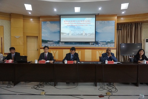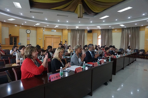 欢迎仪式上,刘晓东校长代表学校致欢迎辞,他首先表达了对迈克尔·莱尼团长及萨凡纳市教育工作者全体嘉宾的问候,对远道而来的美国客人表示热烈的欢迎。他简单介绍了九江学院的办学历史与规模、办学特色和国际交流情况。刘校长说,今年是永利yl23411集团官网第二次承接美国萨凡纳市教育工作者中国文化体验团,永利yl23411集团官网高度重视并做了精心安排:既有教学实践、又有学术讲座;既有大学座谈交流,也有中小学考察观摩;既有自然风光欣赏,又有人文景观体验。同时,我们还会走出九江,感受景德镇的陶瓷文化、北京的古都文化等。相信此次项目一定会为萨凡纳市教育工作者了解中国及中国文化、促进中美相互交流和友好起到了很好的作用。最后,刘校长对各位美国校长和教师积极参与孔院活动表示由衷的感谢,对迈克尔·莱尼团长为孔子学院的发展所付出的努力和心血表示赞赏,并相信在迈克尔·莱尼团长和永利yl23411集团官网选派的中方院长罗其娟的共同努力下,两校通力合作,萨凡纳州立大学孔子学院一定会发展得越来越好。