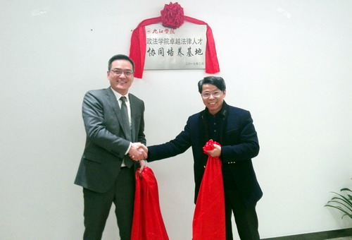 为了落实地方性卓越法律人才的培养目标,实现地方高校社会服务的功能和价值,促进和深化与律师事务所在人才培养、理论培训、实务研讨等方面的合作,3月1日上午,政法学院与江西柴桑律师事务所联合举行了合作共建签约仪式暨卓越法律人才协同培养基地揭牌仪式。政法学院詹建志院长、宛锦春副院长、曹钟安副院长,实验室主任钟文红、副主任陈昊;柴桑律师事务所主任刘晖,副主任简武、周立斌,高级合伙人田玮琅、张立陶、沈峰、潘敏等参加了仪式。