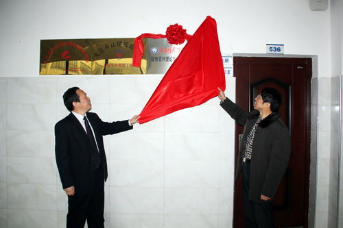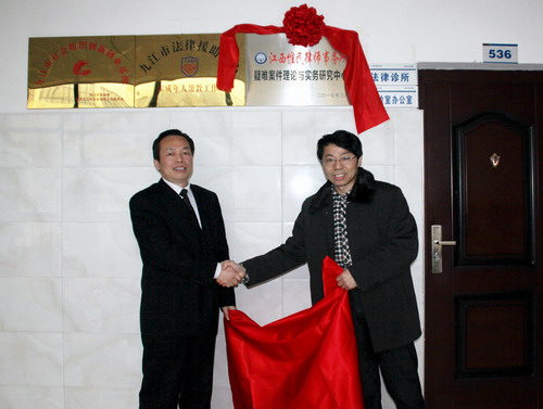 签约之前,政法学院院长詹建志与江西惟民律师事务所主任王辉明共同为双方共建的“疑难案件理论与实务研究中心”揭牌。