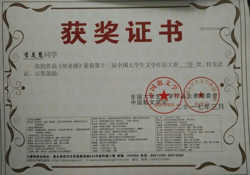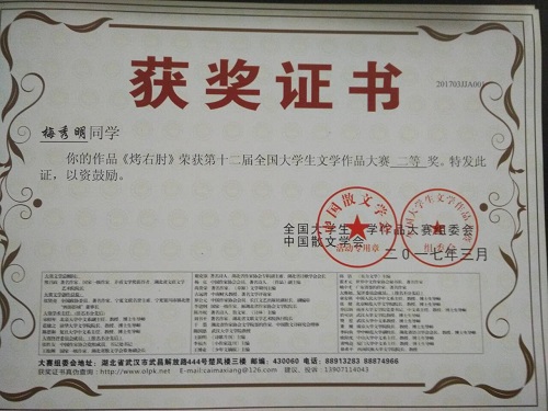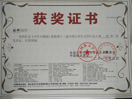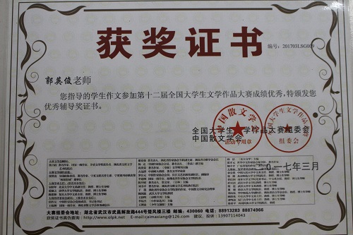 在近日举行的第十二届全国大学生文学作品大赛中,永利yl23411集团官网文传学院积极组织学生参赛,上报了21份作品,经大赛阅卷老师初评、值班评委复评、作家团终审评定,有17篇作品喜获佳绩。