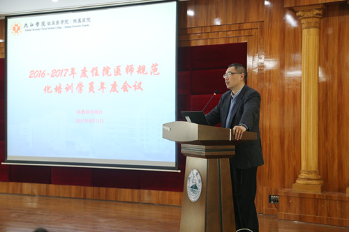 会上,胡志坚副院长对住院医师规范化培训的历史、进展及国家和省卫计委对住院医师规范化培训的政策支持进行了简要的概括,并强调了住院医师规范化培训的重大意义。同时对临床医学院/附属医院2016—2017年度住院医师规范化培训工作成绩表示了肯定,对表现良好的基地提出表扬,同时指出少数基地仍有部分不足之处,并督促各基地持续改进。