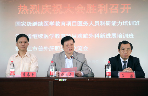 4月29日上午,由临床医学院/附属医院主办的国家级继续医学教育项目医务人员科研能力培训班、江西省继续医学教育项目脾脏外科新进展学习班暨九江市普外肝胆临床经验交流会在临床医学院/附属医院隆重召开。本次会议邀请了美国印第安纳大学终身教授谢经武教授、中山大学附属第一医院肝胆外科博士生导师汪谦教授、南昌大学附属第一医院胃肠外科李正荣教授到会授课。临床医学院/附属医院院长张志平教授、副院长胡志坚教授,基础医学院副院长汪鑫教授、九江市卫计委科教科王俊珠科长等出席开幕式。开幕式由副院长李春平教授主持。