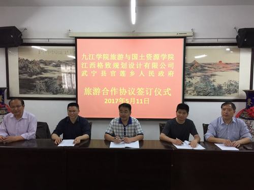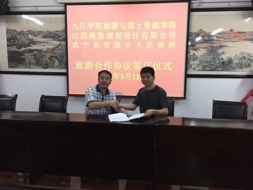 为积极贯彻落实九江学院与武宁县精准扶贫的合作意向,5月11日下午,旅游与国土资源学院、江西格致规划规划设计有限公司与武宁县官莲乡在竞知楼512会议室举行旅游合作协议签订仪式。科研处处长王侃民、组织人事部副部长兼老干处处长燕红波、武宁县官莲乡乡长邓卢武、旅游与国土资源学院院长李松志、江西格致规划规划设计有限公司总经理熊云明参加了签字仪式。