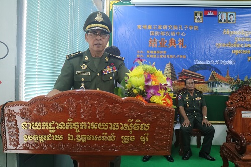 在结业典礼上,国防部军队服务部部长梅兹沙翁在致辞中指出,国防部汉语中心的开设,为军官们学习汉语提供了很大的便利,希望学员们再接再厉,学好汉语,争取赴中国留学深造的机会。同时,他希望孔子学院提供更多的汉语教师,为零基础的学生们增设新的中文班。国防部将给予汉语中心大力支持,为军队培养更多汉语人才,以促进中柬两军的交流。