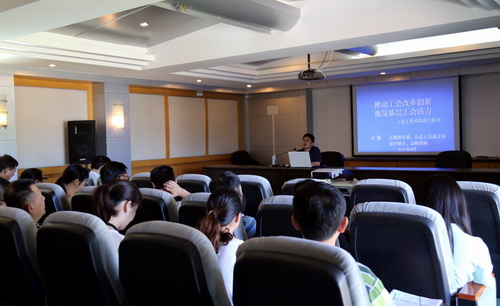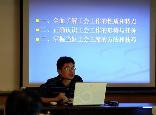 万强副主席的报告分为“全面了解工会工作的性质和特点”、“正确认识工会工作的形势与任务”、“掌握当好工会主席的方法和技巧”三个部分,并围绕工会工作的主要内容这一重点进行了展开。报告首先通过回顾工会的发展历程,明确了工会的性质和定位,基层工会建设的主要任务,并通过身边的案例进行生动说明;二是深度阐述了当前工会工作的新形势;三是提出了基层工会建设的主要任务;四是向我们介绍了做好工会工作的方法技巧;最后提出搞工会工作要有“五公”精神。万强副主席的报告主题明确,内容丰富,见解独到,生动活泼,不时引发阵阵掌声。