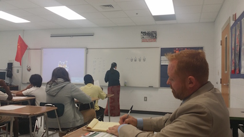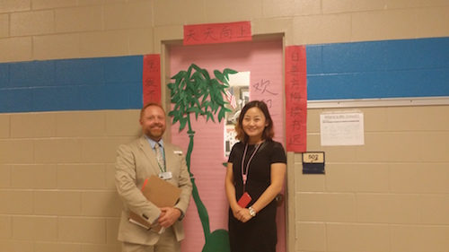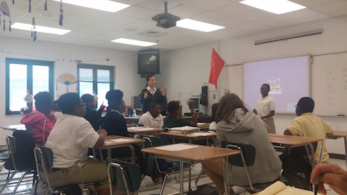 萨凡纳市各学校在飓风“艾玛”之后相继复课,萨凡纳州立大学孔子学院中方院长罗其娟与萨凡纳市公立中学外语教学项目负责人马克·林斯基博士(Dr. Mark Linsky)于当地时间9月21日上午一同前往孔子学院的两所中学教学点,看望汉语教师,了解她们近期的工作与生活情况并进行随堂听课。