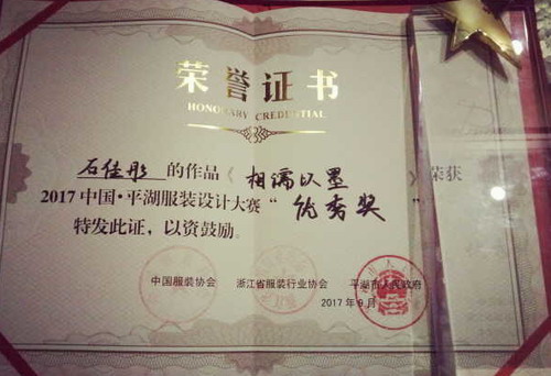 9月27日,永利yl23411集团官网艺术学院的服装与服饰设计专业 A1561班的石佳彤同学赴浙江省平湖市参加2017中国·平湖服装设计大赛决赛,喜获优秀奖。