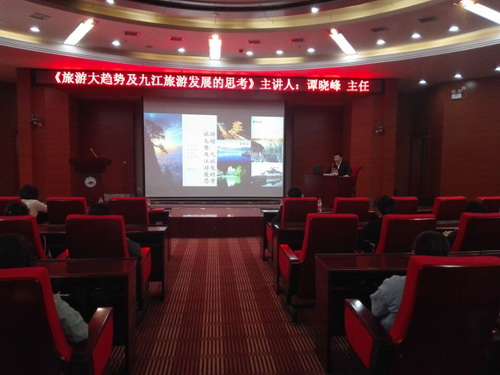 谭主任的讲座主要分为六个部分:一、旅游的时代特征;二、旅游的发展趋势;三、旅游让生活更美好;四、九江旅游文化解读;五、九江旅游发展现状;六、九江旅游的发展思路。谭主任以其专业的知识,丰富人生阅历及富有哲理的语言讲述了未来旅游业发展的大趋势,并畅想九江旅游未来的大发展。谭主任特别强调,随着中国经济深入发展,人民对美好生活向往的不断增加,未来旅游业前景一片大好,青年学子们想成就一番事业,从事旅游业是极好的选择。
