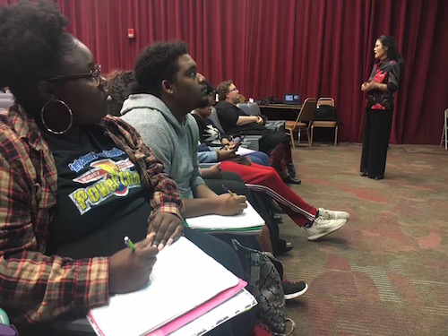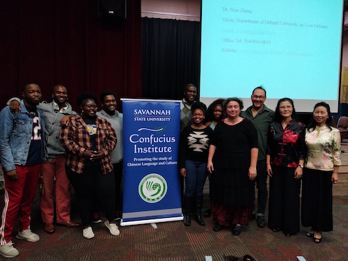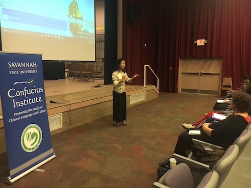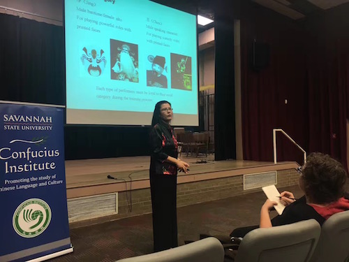 当地时间11月9日,萨凡纳州立大学孔子学院特别邀请了新奥尔良市迪拉得大学音乐系教授张雯在萨凡纳州立大学大学埃尔默尔表演厅(Elmore Theatre)举办了一场别开生面的京剧工作坊。