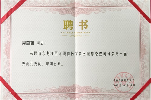 近日,江西省预防医学会医院感染控制分会第一届学术年会在南昌召开。临床医学院/附属医院院感科科长周燕丽获聘省预防医学会医院感染控制分会委员会委员。