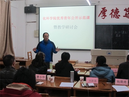 为了更好地培养青年教师,提高青年教师的教学能力和教学水平,12月1日下午,化环学院在向学楼503教室举行优秀青年教师公开示范课暨教学研讨会,学院党委书记刘新强,副院长杨期勇、曹小华、院教学督导专家、学院全体青年教师参加,学院还特邀了校督导专家周玛莉教授莅临指导,会议由曹小华副院长主持。