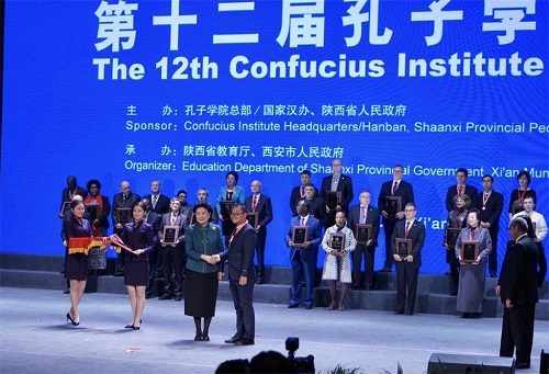 12月13日,为期两天的第十二届全球孔子学院大会在陕西西安曲江国际会议中心闭幕。柬埔寨王家研究院院长宋独(Sok Touch)、柬埔寨王家研究院孔子学院柬方院长苏碧娜(Vuth Sophakna)、中方院长夏修龙和汉语教师赵雨参加此次会议。赵雨老师荣获“孔子学院先进个人”称号,国务院副总理、孔子学院总部理事会主席刘延东为其颁发荣誉证书。