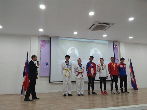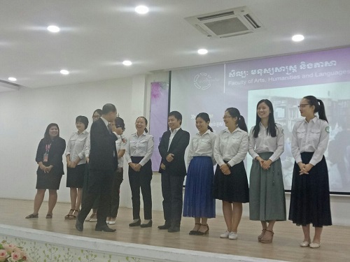 开学典礼上,谢索皮校长邀请中文系全体教师上台亮相,柬埔寨孔子学院中文系主任孙海瑞老师代表孔子学院发言,他对新生的到来表示欢迎,他说,青年一代的学生们,你们是学校乃至社会的希望与未来,希望你们能在这里获得长足的进步,得到健康的成长。