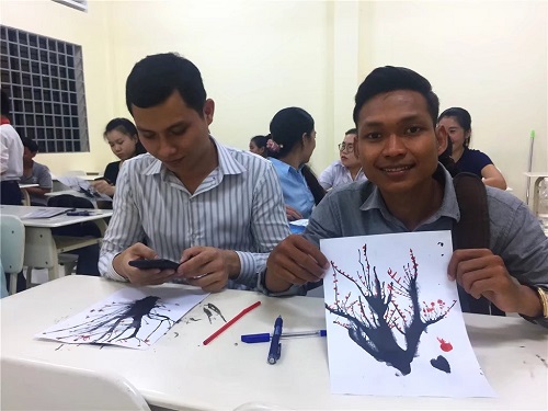 在志愿者教师杨洁的班上,“吹墨梅花”的春节班级活动热闹地进行着。当老师拿着墨水、颜料走进教室时,学生们跃跃欲试。当他们发现今天要画梅花儿的时候,全都听得特别认真。进行了简单的步骤说明以后,学生们就开始进行创作了。他们在画画的同时感受到了趣味性,并对中国的文化加深了了解。大家画出来的都非常好看,互相请教,相互交流,场面好不热闹。学习汉语三年的田西南同学(SYNAT)表示,她非常喜欢今天的活动,墨水原来这么神奇。同学们都非常喜欢自己的作品,并在活动最后合影留念珍藏。