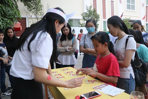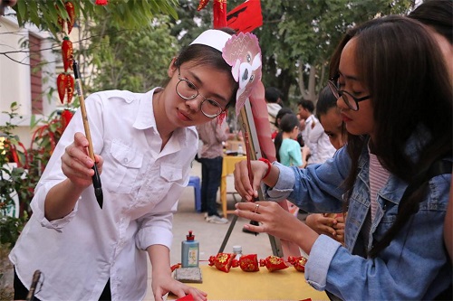 本次新春游园会以“十犬十美 庆贺新春”为主题,以“狗年”为活动设计元素,共设有10个游戏馆,各馆以不同的中国传统春节文化为主题,包括写春联、贴春联、贴年画、看春晚、团圆饭、吃饺子等,每个场馆由一名志愿者老师负责,设置了不同的中国传统游戏让学生们参与,如写春联、丢福袋、夹豆子比赛、翻红包等。精彩有趣的游戏吸引了众多学生的参与,操场上人头攒动。为了集齐各馆的“旺旺”狗狗贴纸以换取新春礼品,学生们激动兴奋地穿梭于各馆之间,积极参与各馆主题游戏。各馆负责老师耳边萦绕着学生们的欢声笑语:“老师,这个馆怎么玩?”,“老师,我马上就要得到十个‘旺旺’贴纸了!加油!”,“老师,你看,我的积分卡换到了一把扇子!好开心!”。馆前还围着很多想参加游戏的学生,急切渴望而又兴奋难抑的心情在他们的眼神中显现,现场气氛活跃,热闹非凡。