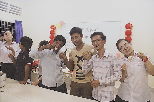 活动中,吴哥高中孔子课堂负责人刘振老师说:元宵节是春节之后的第一个重要节日,中国人把一年中第一个月圆之夜正月十五称为元宵节。希望学员们在学习汉语的同时,对中国的传统节日有更深刻的认识。伴着热闹的气氛,元宵的馨香扑鼻而来。师生一起品味元宵,同时也就中柬元宵节的异同进行了讨论。参与本次活动的学生李淑香(Leu Sokheang)说:“这是她第一次在学校和大家一起过中国的元宵节,听着老师讲元宵节的故事和习俗,大家一起热闹地猜灯谜,还能尝到现做的元宵,非常开心,希望老师们能够在柬埔寨过一个快乐的元宵节。”