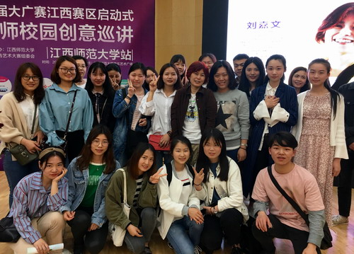 4月13日上午,文传学院余宁春老师带领29名学生,赴江西师范大学瑶湖校区,参加第十届大广赛江西赛区启动仪式暨名家名师校园创意巡讲活动。