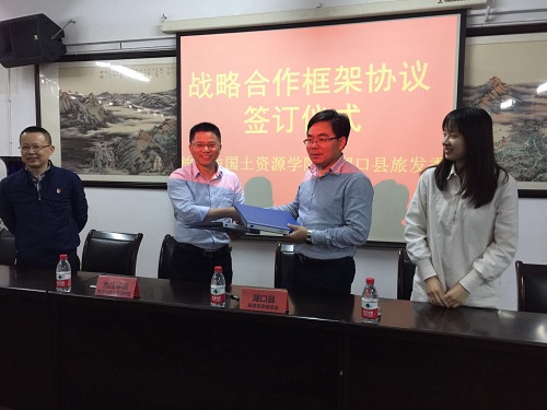 为积极推动校地战略合作,加强高校与地方的联系与交流,落实九江学院与湖口县人民政府签订的战略合作框架协议,4月20日上午,旅游与国土资源学院与湖口县旅游发展委员会在竞知楼512会议室举行合作协议签订仪式。湖口县旅游发展委员会主任吴林东、旅游与国土资源学院院长李松志、党委书记黄伟参加了签字仪式。