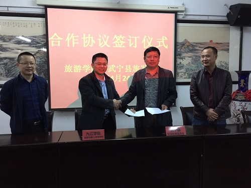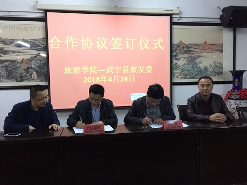 为进一步推动校地战略合作,加强高校与地方的联系和交流,充分发挥九江学院旅游与国土资源学院专业人才高地优势,为武宁县旅游业发展提供更多的智力支持,4月24日中午,旅游与国土资源学院与武宁县旅游发展委员会在竞知楼512会议室举行合作协议签订仪式。武宁县旅游发展委员会主任李选平、旅游与国土资源学院院长李松志、党委书记黄伟参加了签字仪式。