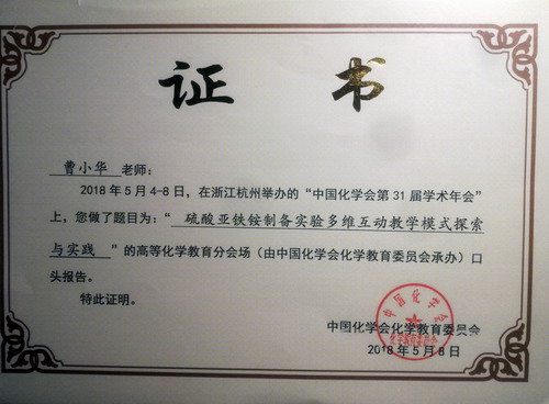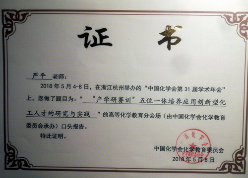 会上,永利yl23411集团官网化环学院和药生学院教师共提交了5篇论文参与交流,并应邀在高等化学教育分会做2场口头报告。占昌朝教授研究成果进行了墙报展讲,获得同行知名专家的一致好评。会议期间,永利yl23411集团官网参会代表积极与国内外同行进行了广泛深入的学术交流,积极宣传和介绍永利yl23411集团官网教学科研成果,同时虚心向知名专家学习,开阔了科研工作思路,密切了与同行的学术联系,进一步扩大了学校影响。