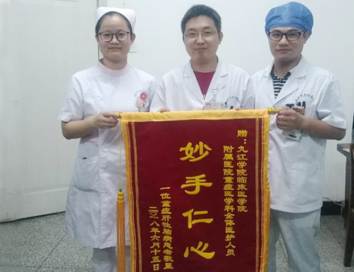 患者因“发现肝癌2月余,腹泻、发热1周,加重伴意识障碍8小时”入临床医学院/附属医院ICU抢救,入院时病情危重,呈昏迷状态。通过科主任叶兴文及主治医生刘松等医护人员的连夜全力抢救,患者于第二天苏醒过来。经过重症医学科全体医务人员半个月的精心治疗和护理,患者的病情得到了好转和稳定,顺利出院。为了表达对叶主任及刘医生精湛医术的赞赏和对全体护士细心护理的感激之情,患者送来感谢信与锦旗,称赞他们医术精湛,护理专业。