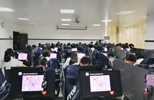 此次考核在检验专业负责人胡志坚副院长的指导下,由教学管理科、临床技能中心及医学检验教研室经过多次讨论并制定科学、严密的考核方案。考核共设七站,第一站为形态学考核,第二站为质控图判读,第三站为血涂片制备,第四站为白细胞计数,第五站为革兰染色,第六站为移液器的使用,第七站为临床思维与临床沟通。全过程运用临床技能中心OSCE考试系统,并全程录播,考试秩序井然有序。