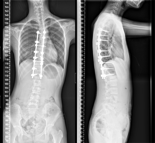 术后护理团队制定了详细的护理计划,严密观察患者生命体征及切口情况。在科室全体医护人员的共同努力下,小冰术后各项指标恢复良好,术后68小时便拔除引流管,并佩戴支具下床活动。复查脊柱全长片提示脊柱S型弯曲得到了充分矫正,双肩等高,剃刀背畸形消失。术后,小冰终于可以正常平卧睡觉,而且身高达到164.5cm,较术前足足增高了4.5cm。
