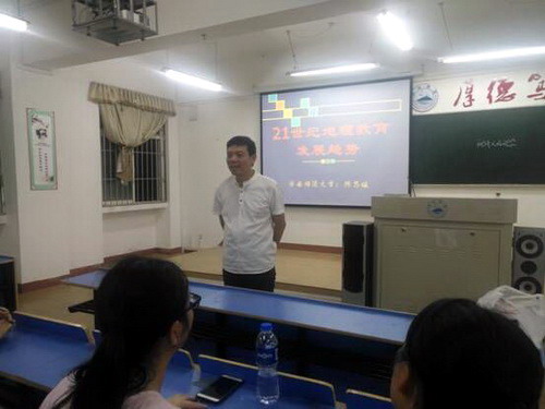 讲座中,陈教授系统回顾了中外地理教育发展的历史进程,从地理教育国际宪章、理解正在变化的星球、基础教育课程改革三个层面阐述了世纪之交的新课改运动,从知识化与生活化、知识化与观念化、学科化与部件化、民族性与全球性四个角度介绍了新世纪地理教育的发展趋势。陈教授的讲座案例充分、语言生动、分析透彻,既有严谨的逻辑论证,又有贴切的示例穿插穿插,整场讲座既是学术浓郁的专业讲解,又是趣味生动的地理课堂示范教学。