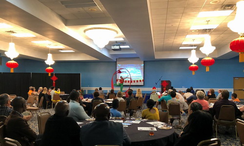 萨凡纳州立大学的学生活动中心演播大厅张灯结彩,喜气洋洋,座无虚席,萨凡纳州立大学教务长兼副校长迈克尔·莱尼博士(Michael J. Laney)、国际交流中心主任伊曼纽尔· 纳纽泽伊博士(Emmanuel Naniuzeyi)、校长办公室首席法务官福罗拉·德万博士(Flora Devine)和七十多名师生代表,萨凡纳市中小学教师代表以及来自周边社区爱好中国文化的居民,共百余人参加了庆祝活动。